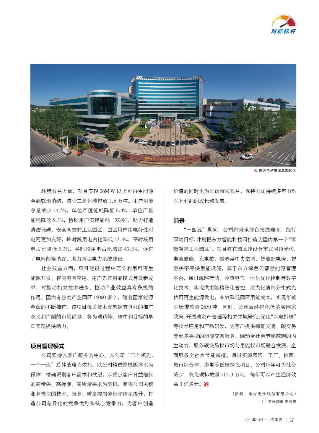 “十四五”期间,公司将秉承绿色发展理念,践行双碳目标,计划把东方智能科技园打造为国内第一个“零碳智慧工业园区”。项目将在园区建设分布式屋顶光伏、电池储能、充电桩、磁悬浮中央空调、智能配电房、智慧楼宇等供用能设施。基于东方绿色云智慧能源管理平台,通过源网荷储、冷热电气一体化优化控制等数字化技术,实现供用能精细化管控,最大化消纳分布式光伏可再生能源发电,有效降低园区用能成本,实现年减少碳排放量2650吨。同时,公司后续将积极落实国家政策,开展碳资产管理等相关领域研究,深化“以电折碳”等技术应用和产品研发,为客户提供绿证交易、碳交易等更多类型的能源交易服务,调动全社会节能减碳的内生动力,服务碳交易权市场与用能权市场融合发展,全面服务全社会节能减排。通过实施园区、工厂、校园、城市综合体、岸电等低碳绿色项目,公司每年可为社会减少二氧化碳排放量715.3万吨,每年可以产生经济效益3亿多元。