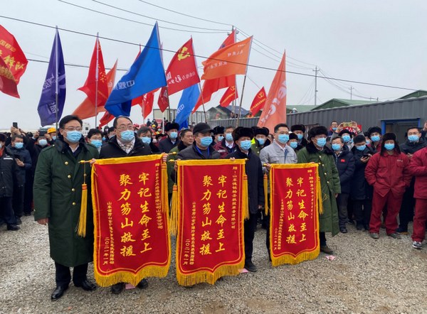 1月25日10时,山东省笏山金矿爆炸事故应急救援指挥部在救援现场进行了锦旗授予,以感谢在救援行动中有担当、有责任、表现突出的单位。山东省委常委、常务副省长王书坚、山东省副省长汲斌昌、烟台市委副书记、市长陈飞等领导为各单位颁发锦旗,股份公司代表公司接收锦旗。
