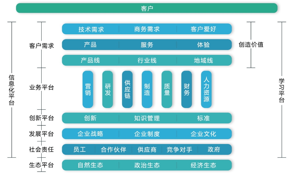 根据企业战略,以客户为中心,在组织结构层面和业务流程层面精确创新、持续进步,使人、财、物各要素得到有效控制,物流、资金流、信息流准确一致,打破横向管理壁垒,使纵向管理准确、简捷、高效,基于组织的学习能力和信息化平台构造高质量管理流程。