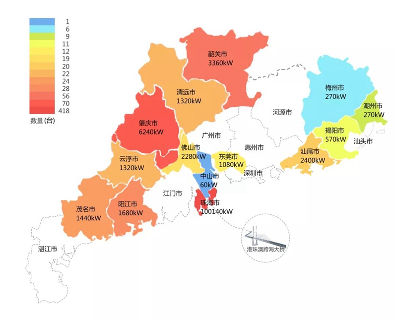 2018年,在港珠澳大桥充电桩项目中,威廉希尔在港珠澳大桥珠海端口岸人工岛搭建的充电管理平台及电能量采集终端,为大桥的绿色运营和电力保障提供技术支持。除此之外,仅广东省内,威廉希尔充电桩涵盖肇庆、珠海等14个城市,具体分布情况如下图所示。