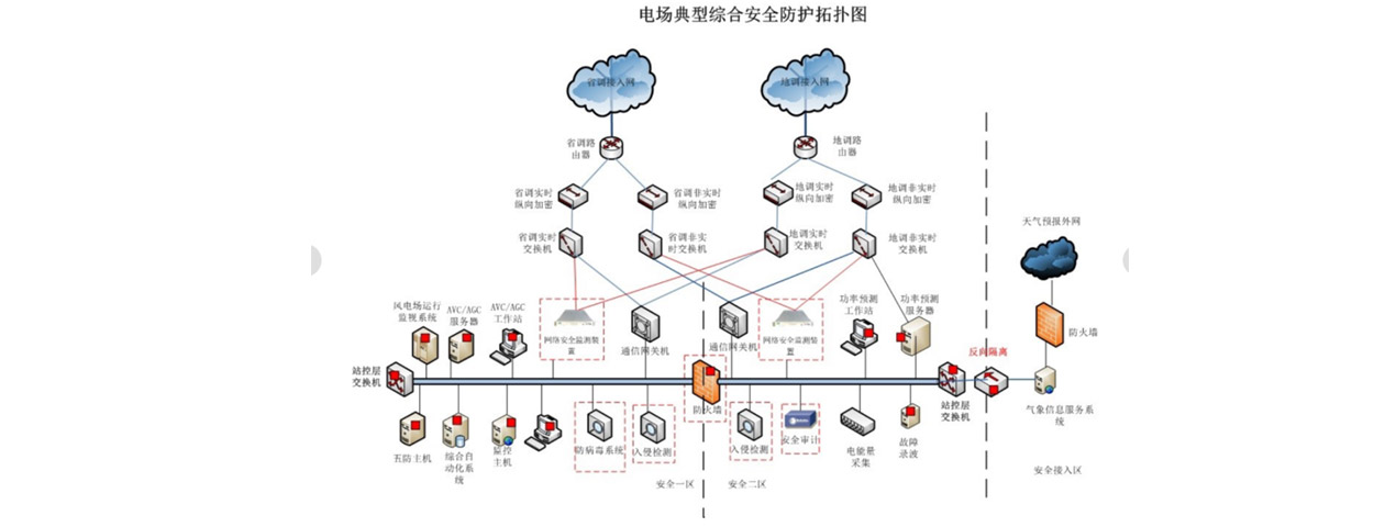 当前严峻的国际安全形势,我们在新能源场站SCADA系统建设方案上依据《网络安全法》规定,严格执行发改委《14号令》、国家能源局关于新能源场站SCADA系统安全防护的要求,强化安全管控。安全防护上不仅遵循已有 “安全分区、网络专用、横向隔离、纵向认证”基本原则【亦称“十六字”方针】,还增加了36号防护方案的“综合防护”安全建设,提升生产控制大区的安全防护能力,满足电力安全防护的要求。