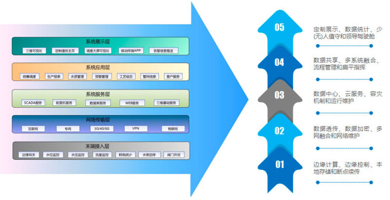 SCADA生产调度管理系统是供水生产管理调度总体解决方案的具体实现,它将城市供水生产监控、调度、数据分析模型和业务管理统一到一个综合性的系统平台,实现了供水全过程生产运行数据采集存储、运行情况可视化展示、调度分析决策、业务过程管理、异常检测预警及运行能效分析和报表管理等内容,为全面提升调度管理水平,将以传统经验调度和数据调度为中心向以智能优化调度管理为中心的延伸、扩展,也是工作方式的根本性转变和提升,是调度管理科学化、规范化、流程化、精细化、电子化、网络化和动态化的重要方式。