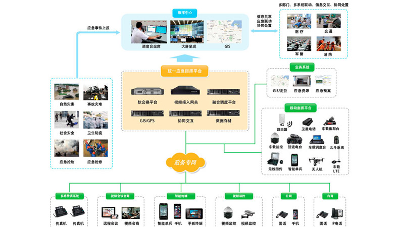 目前,公共安全事件及群体性事件时有发生,应对城市突发公共事件已成为政府部门一项非常具有挑战性的工作。如何高效利用有限的资源,提高政府部门对紧急事件快速反应和抵御风险的能力,并为人民群众提供更快捷的紧急救助服务,成为政府职能部门的主要工作内容之一。政府综合应急指挥调度系统旨在帮助政府相关工作部门轻松完成大范围、不同人员统一通信指挥,实现全员协同通信、实时可视指挥、资源GIS管控调度和图形化任务交互,具备同时处理多起突发事件的能力,提高对应急事件的能力和应急处置效率。