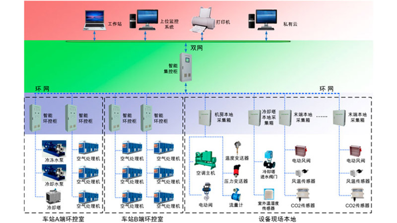 地铁中央空调整体节能控制系统是以智能控制为基础、以节能降耗为核心目标,并同时融合机房综合管理及大数据云服务等功能,大幅度提高机房设备实际运行效率,提升系统运行COPS,降低运营成本,提高暖通空调全生命周期内的用能质量及管理效率。