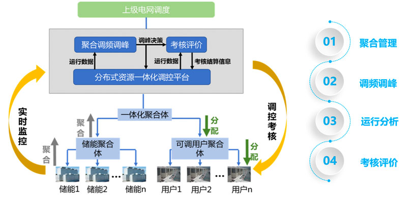 聚合管控平台将分散的用户侧可控资源进行聚合管理和智能调度,评估其需求响应调节能力并参与需求响应申报。将从上级负荷泛在调度平台获得的调节指令进行优化分解并下发各可控负荷执行。对其执行情况进行考核,并进行收益分配结算。